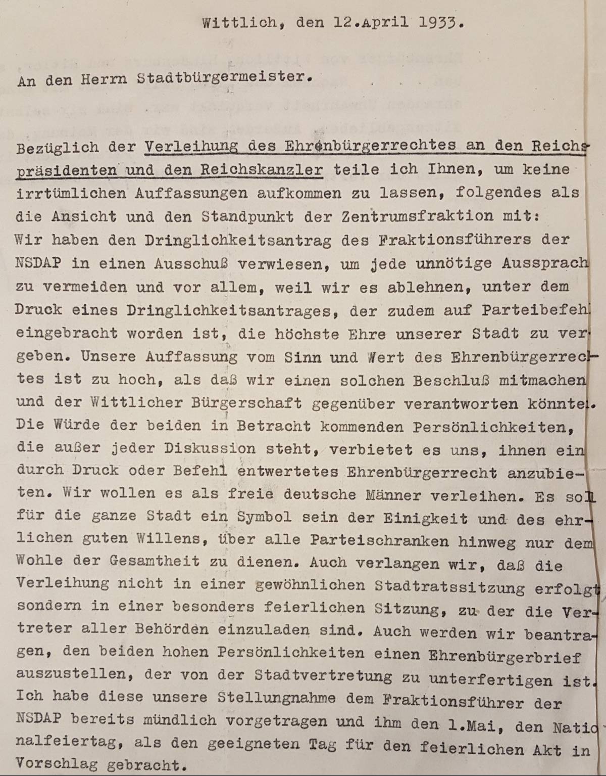 Das Ansinnen der NSDAP-Fraktion, vor allem Hitler (zusammen mit Hindenburg) durch einen „Dringlichkeitsantrag“ vom 1. Februar 1933 zum Ehrenbürger Wittlichs zu machen, verhinderte die Zentrumsfraktion unter Leitung von M.J. Mehs bei der ersten Stadtverordnetensitzung Ende März 1933.