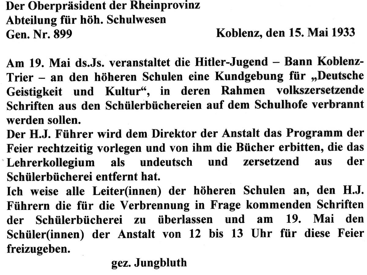 Eine direkte Verbrennung von Büchern wie beispielsweise an Schulen in Koblenz ist für Wittlich nicht nachgewiesen.