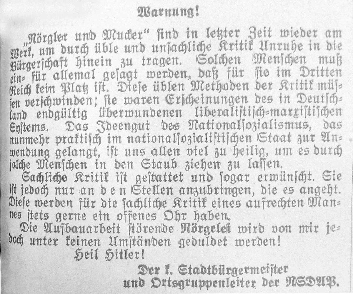 Im Frühjahr 1934 organisierte Propagandaminister Goebbels eine großangelegte, reichsweite Kampagne gegen „Nörgler und Mucker“. Im NS-Jargon waren das „Volksgenossen“, die noch wagten, Kritik am NS-Regime zu üben und damit vor allem die Autorität der örtlichen „Amtswalter“ gefährdeten. An dieser Kampagne war auch die Wittlicher NSDAP unter Führung von Ortsgruppenleiter Dr. Hürter stark beteiligt, und zwar schon bevor der offizielle Start aus Berlin (am 12. Mai 1934) bekannt gemacht worden war. Mehs sieht die eigentlichen Adressaten dieser Kampagne in den Reihen der Nationalsozialisten und benennt auch Beispiele einer sich breitmachenden Unzufriedenheit innerhalb der Wittlicher NSDAP (TB vom 21. April 1934).
