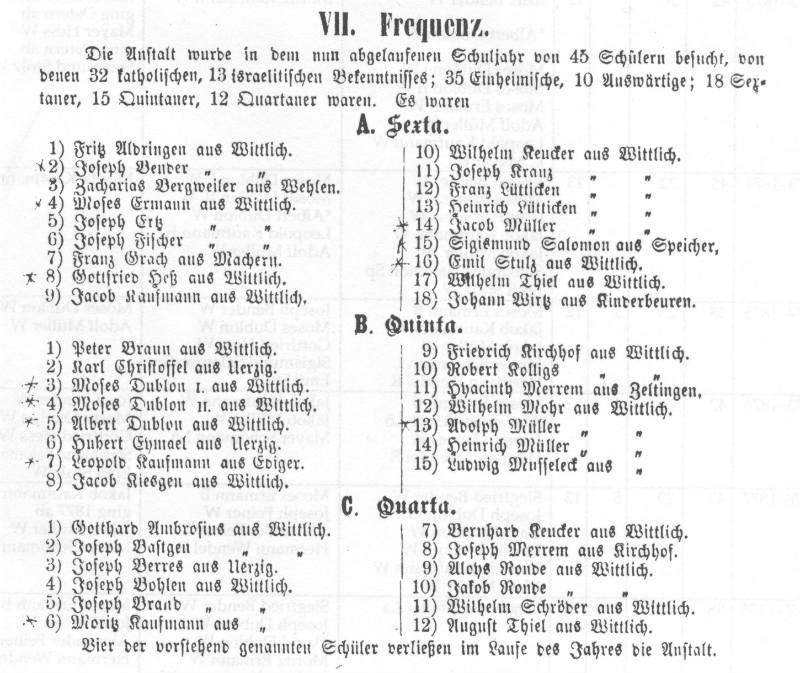 Das Foto oben zeigt eine Abgangsklasse der Höheren Stadtschule Wittlich (höhere Knabenschule). Sie befand sich in der Karrstraße und nahm Schüler ab dem 10. Lebensjahr auf. Auch Kinder aus jüdischen Familien besuchten die Schule seit ihrer Gründung.