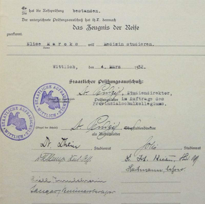 "... Von 1919 bis 1923 besuchte ich die örtliche jüd. Volksschule, von 1923 bis 1928 das Mädchengymnasium* in der Kurfürstenstr. Dann ging ich auf das Cusanusgymnasium (damals Aubauschule genannt) über, wo ich im Jahre 1932 die Reifeprüfung ablegte. Mit mir zusammen in der Klasse befand sich noch ein Schüler jüd. Glaubens (Hans Ermann). Wir hattten beide sher gute Beziehungen zu d. Klassenkameraden u. den Lehrer, waren beliebt und hatten nie unter Diskreminierung zu leiden. Dieser Zustand veränderte sich nicht bis zum Ende der Schulzeit 1932."