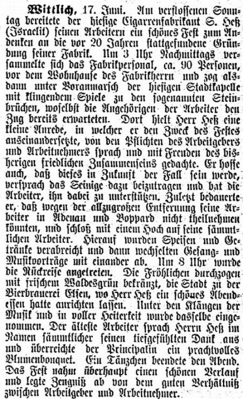 Zu den bekannten größeren Betrieben zählte die Zigarrenfabrik von Samuel Hess in der Oberstr.1, gegründet 1887. Die Firma expandierte sehr schnell. Es gab Niederlassungen in Boppard, Adenau und Manderscheid. Samuel Hess war ein bei seinen Arbeitern beliebter Chef. Wegen Erbteilung wurde die Firma 1904 gelöscht.
