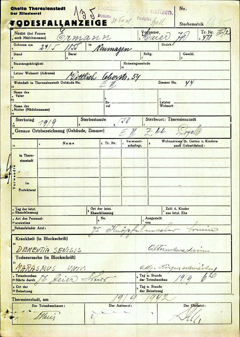 Auch aus anderen Orten kamen in dieser Zeit noch Wittlicher Juden nach Theresienstadt. Der älteste, der von Wittlich deportiert wurde, war Mayer Ermann mit 87 Jahren. Er starb bereits knapp zwei Monate nach der Deportation in Theresienstadt, in der Nacht, bevor viele aus seinem Transport in die Tötungsstätte Treblinka gebracht und dort ermordet wurden (siehe Bild links)